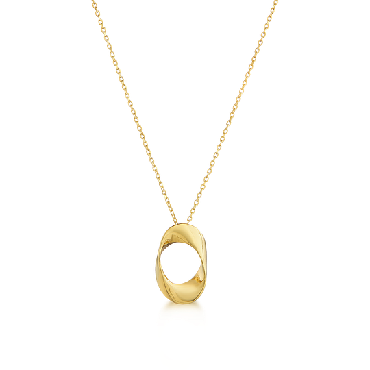 Colare em prata dourada com medalha em forma de elipse recortada com volume. Fio ajustável.