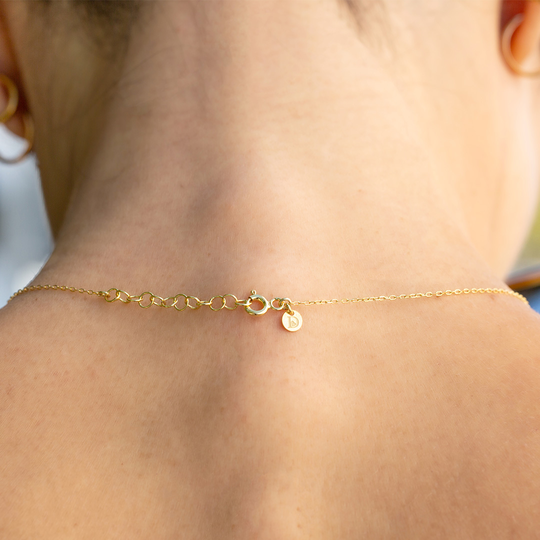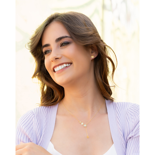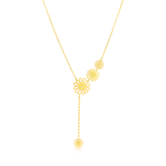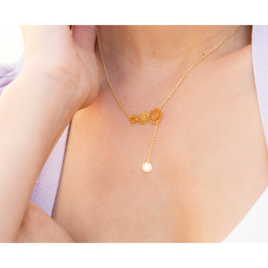 Colar em prata dourada com margaridas assimétricas, uma delas pendendo de um fio no centro. Fio ajustável. Embalagem sustentável. Floral é uma coleção original da Dlight.