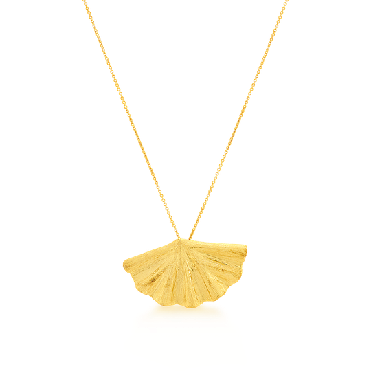 Colar em prata dourada com medalha com acabamento fosco, em forma de leque. Colar ajustável.