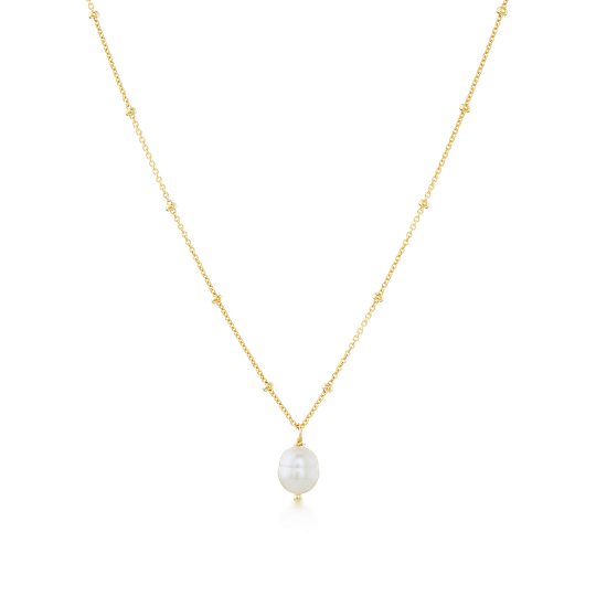 Colar de malha com pequenas esferas em prata dourada 925 e uma pérola de água doce. Fio ajustável.