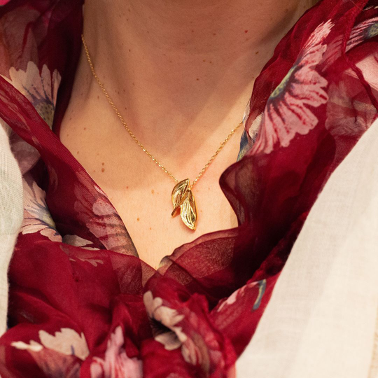 Colar em prata dourada com pendente em forma de duas folhas. Fecho ajustável.