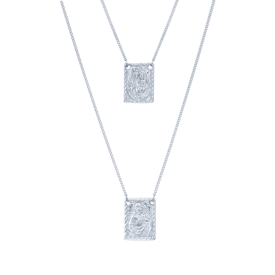 Colar escapulário em prata com duas medalhas: o Sagrado Coração de Jesus e a Virgem Maria com o Menino.