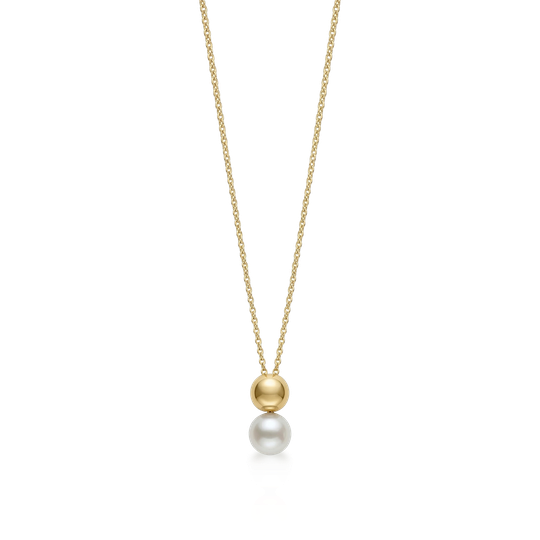 Colar em prata dourada com pendente de pérola de água doce e esfera polida. Um modelo delicado e intemporal, perfeito para qualquer ocasião.