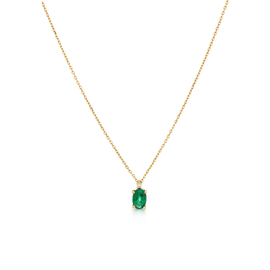 Delicado e sofisticado, este colar em ouro de 19,2 quilates combina o brilho dos diamantes com a intensidade da esmeralda em lapidação oval. Uma jóia intemporal que traz elegância a qualquer ocasião.