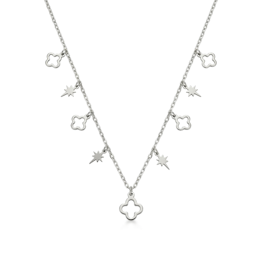 Colar em prata com delicados pendentes de estrelas e trevos ao longo da corrente. Um modelo leve e elegante que acrescenta brilho e movimento ao look.