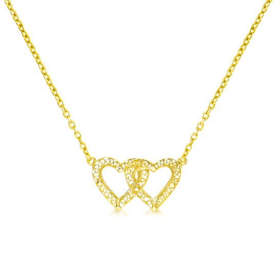 Colar em prata 925 dourada com dois corações em filigrana entrelaçados. Um delicado símbolo de afecto.