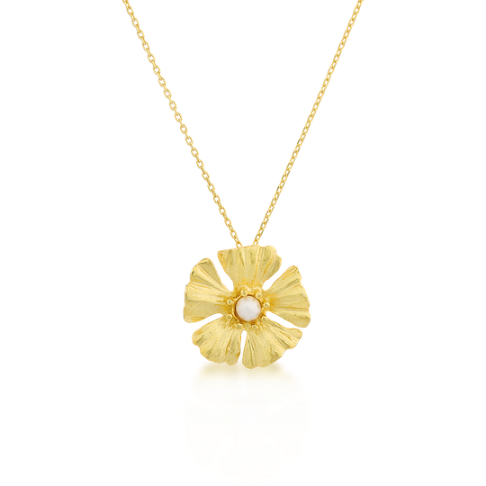 Inspirado na leveza da natureza, este colar em prata dourada exibe uma flor trabalhada com textura acetinada e uma pérola de água doce no centro. Um detalhe elegante para usar sozinho ou em conjunto com os brincos da mesma linha.