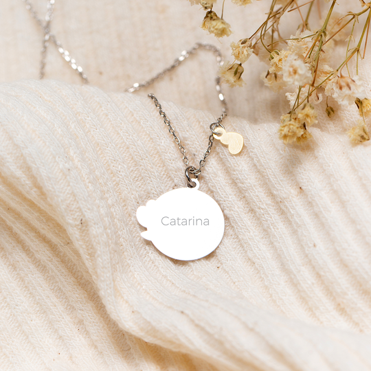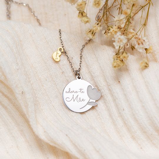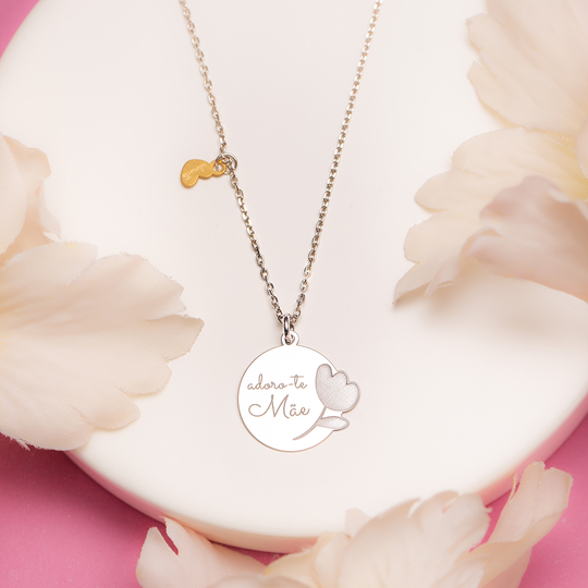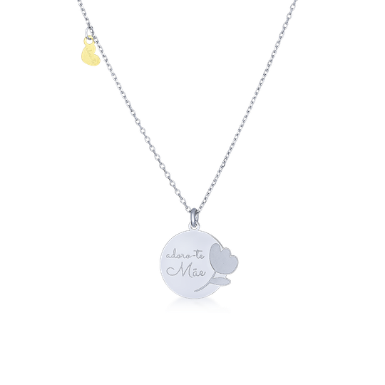 Colar em prata com pendente redondo com pequena flor e com gravação da palavra “Mãe”. Pequeno pendente coração em prata dourada no fio. Uma bonita surpresa para as mães.
