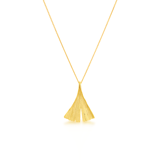 Colar em prata dourada com medalha com acabamento fosco em forma de folha esguia. Colar ajustável.