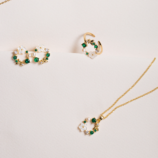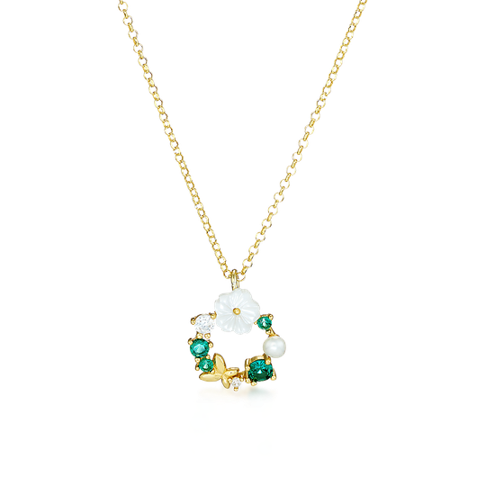 Colar em prata dourada em forma de grinalda com zircónias verdes e incolor e flor branca. A coleção À Flor da Pele marca uma Primavera feliz.