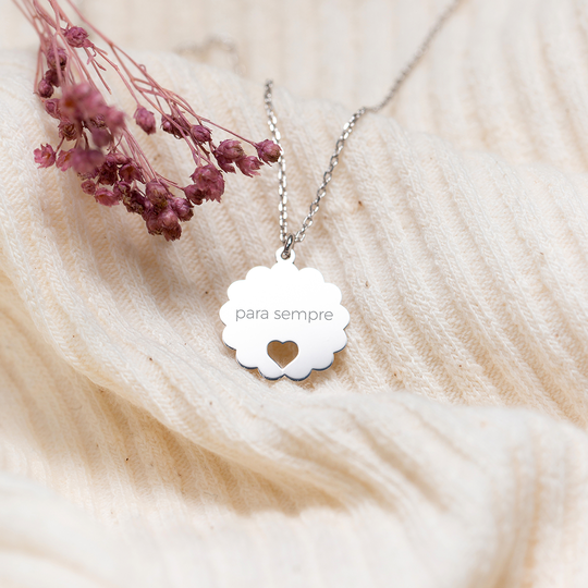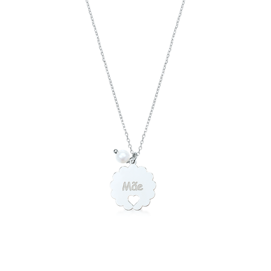 Colar em prata com medalha redonda ondulada e pequeno coração recortado, e pequena pérola. Com fio ajustável. Pendente com a mensagem "Mãe" que pode ser personalizado com uma gravação no verso, como a assinatura, por exemplo.