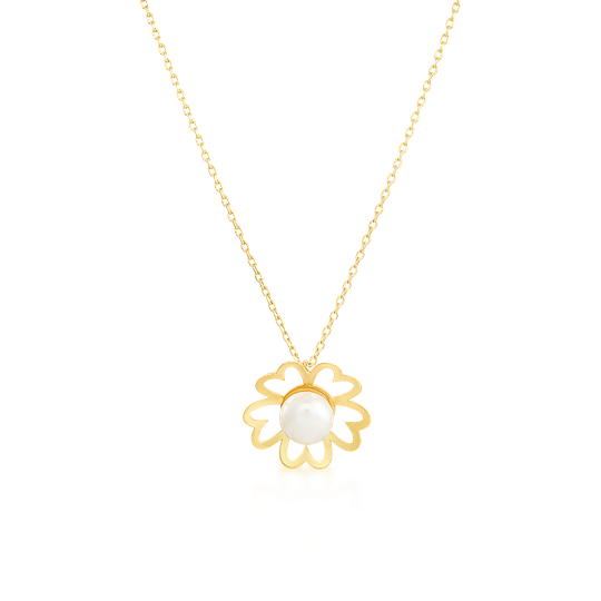 Colar em prata dourada com pendente com forma de flor margarida recortada e pérola no centro. Fio com fecho ajustável.