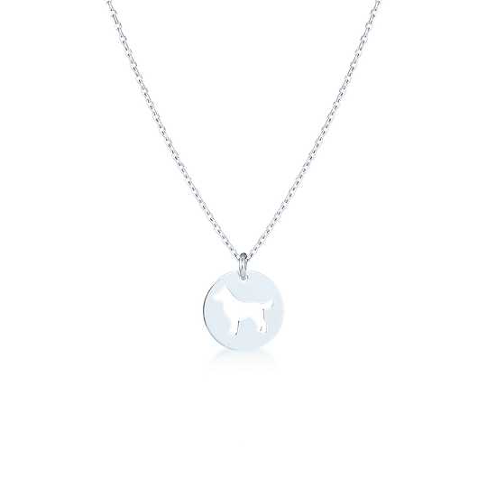 Colar de criança com medalha redonda com cão recortado em prata. Para os verdadeiros amigos dos caninos.