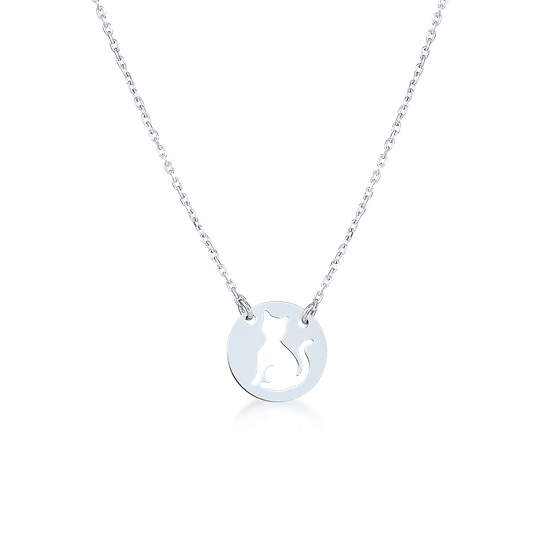 Colar de criança com medalha redonda com gato recortado em prata. Para os verdadeiros amigos dos felinos.