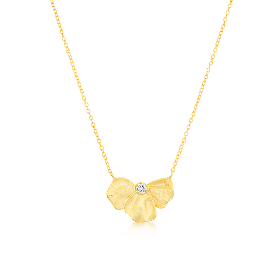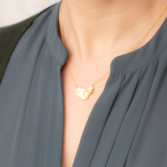 Colar em prata dourada com pendente em forma de meia flor com zircónia. Colar ajustável.