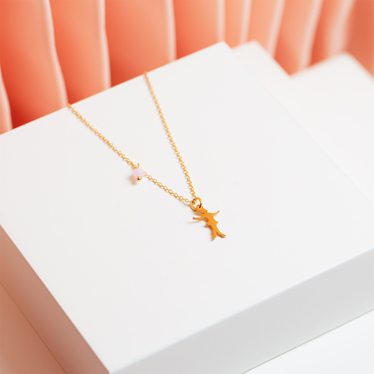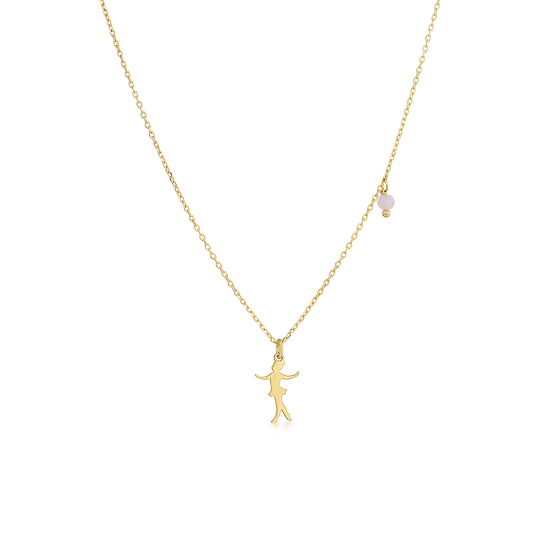 Colar em prata dourada com pendente menina bailarina. Fio ajustável com gema rosa. Uma criação do Lugar da Jóia.