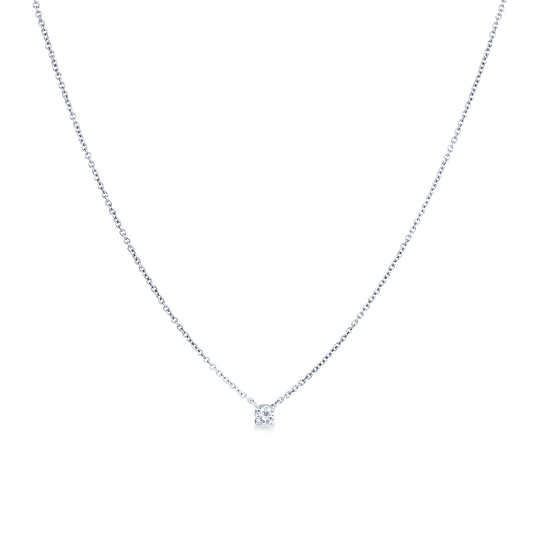Colar em ouro branco de 19,2 quilates com diamante arredondado. Fio ajustável com pequeno coração no fecho. Sugestão para uma noiva discreta e sublime.