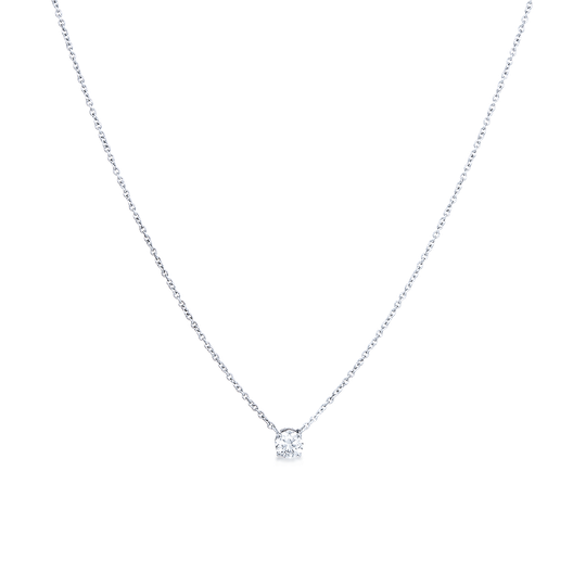 Colar em ouro branco de 19,2 quilates com diamante arredondado. Fio ajustável com pequeno coração no fecho. Sugestão para uma noiva discreta e sublime.