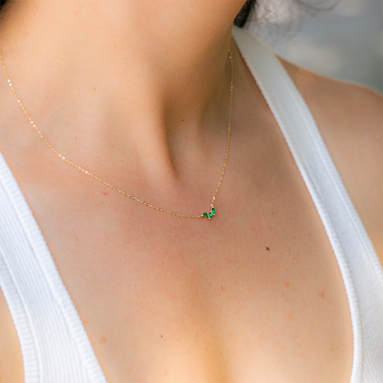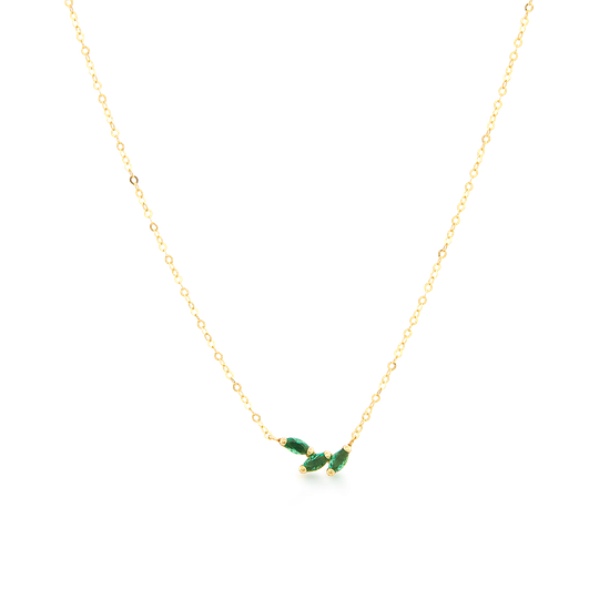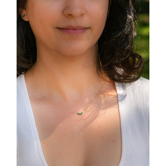 Colar em ouro de nove quilates com três zircónias ovais verdes. Fio ajustável.