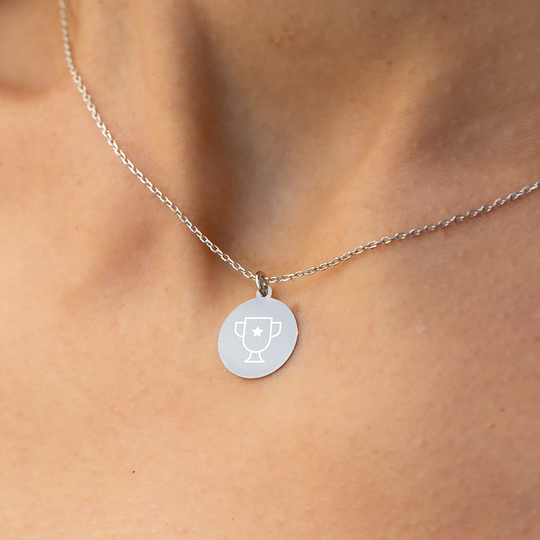 Colar em prata 925 com medalha redonda com gravação de troféu. A peça perfeita para assinalar as vitórias do desporto e da vida. Utilize o campo personalização para definir uma gravação no verso da medalha (máximo de 8 caracteres). O envio é realizado no prazo de dois dias úteis.