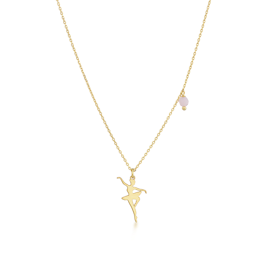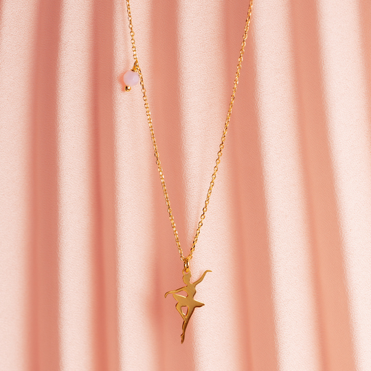 Colar em prata dourada com pendente bailarina. Fio ajustável com gema rosa. Uma criação do Lugar da Jóia.