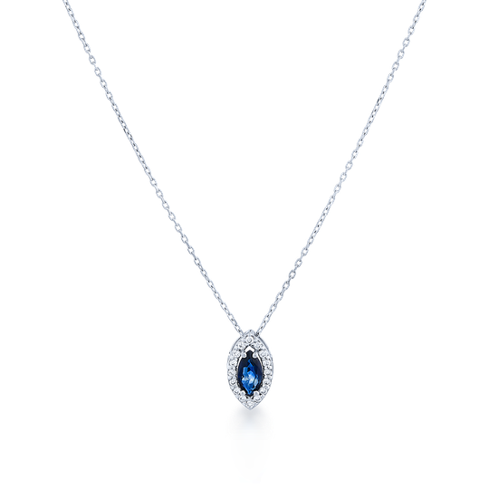 Uma safira azul rodeada por diamantes brancos num pendente elegante e luminoso. Este colar em ouro 19,2Kt é uma celebração do requinte e da beleza intemporal — uma peça que eleva qualquer ocasião. 1 safira e 14 diamantes com 0.096ct