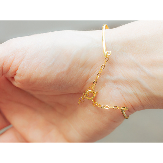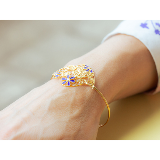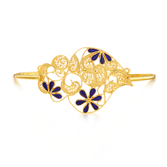 Escrava de filigrana em prata dourada com coração e pequenos apontamentos floridos azuis. Fecho ajustável.