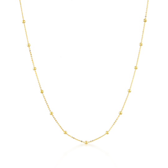 Minimalista e elegante, este fio em prata dourada é composto por pequenas esferas ao longo da corrente, criando um efeito leve e sofisticado. Perfeito para usar sozinho no dia a dia ou como base para composições com outros colares.