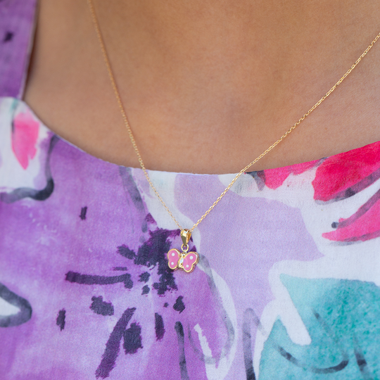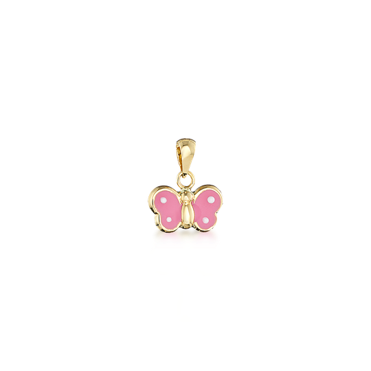 Delicada medalha em ouro de 9 quilates em forma de borboleta com asas cor de rosa. Criada a pensar nas meninas mais pequenas, pode ser usada por pessoas de todas as idades.