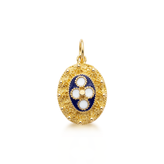 Medalha em prata dourada com caramujo azul em esmalte. Um pendente delicado que combina tradição e cor, perfeito para usar no dia a dia.