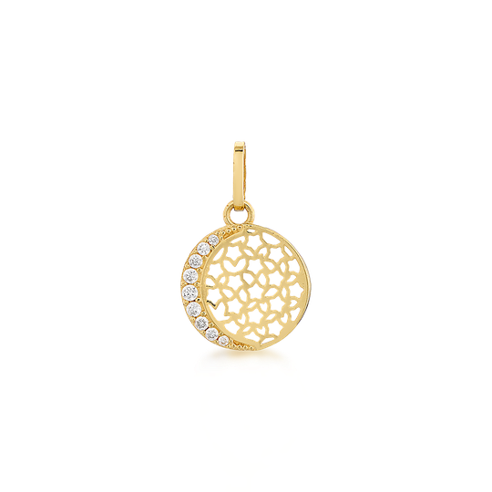 Um céu de símbolos. Esta medalha em ouro 19,2Kt combina um recorte delicado com um contorno em zircónias, evocando mistério e luminosidade. Ideal para criar composições com significado.