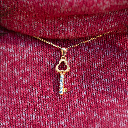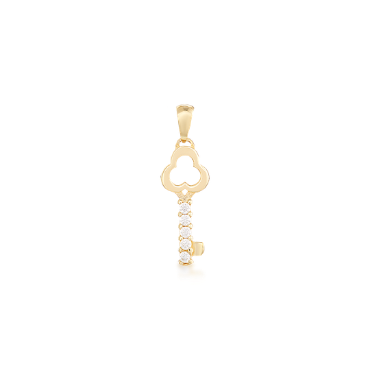 Medalha em ouro de 9 quilates em forma de chave com cinco zircónias incolores.