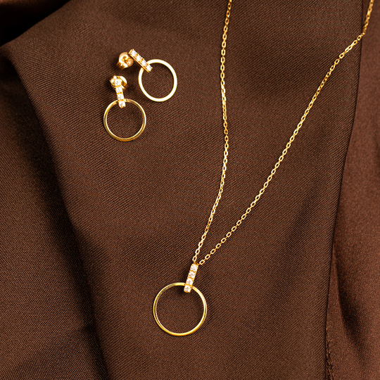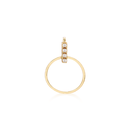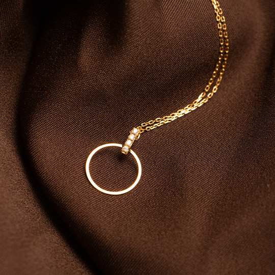 Medalha em ouro de 9 quilates com quatro pequenas zircónias segurando um círculo.