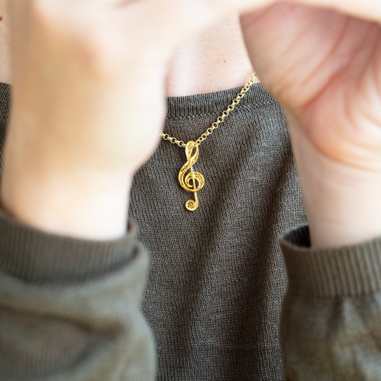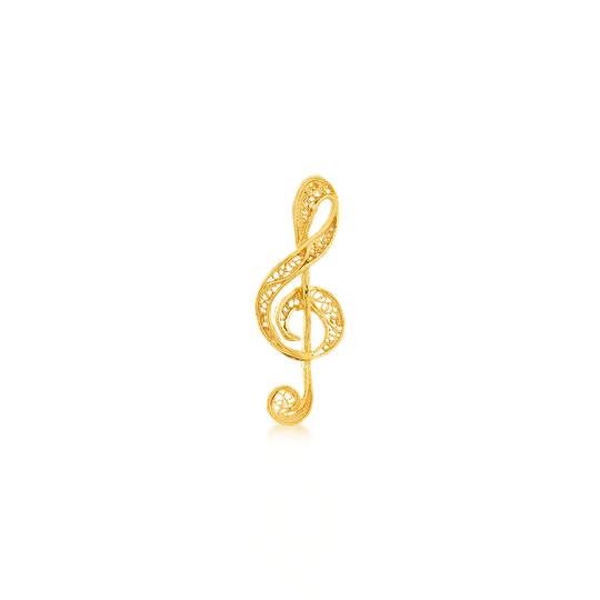 Medalha de filigrana em prata 925 dourada com a forma de uma clave de sol. A jóia perfeita para quem vive a música de modo especial.