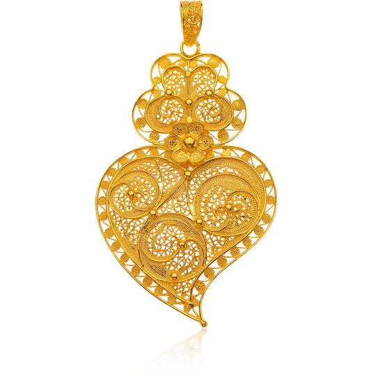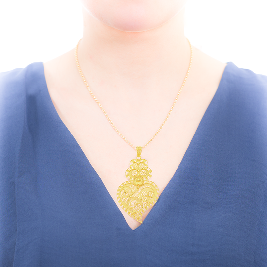 Medalha de filigrana em prata dourada com forma de coração de Viana. De referência histórica na joalharia tradicional portuguesa, a filigrana eleva o carisma da destreza manual. O coração de Viana é uma dos maiores símbolos da portugalidade.