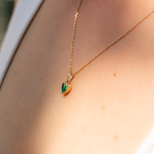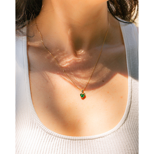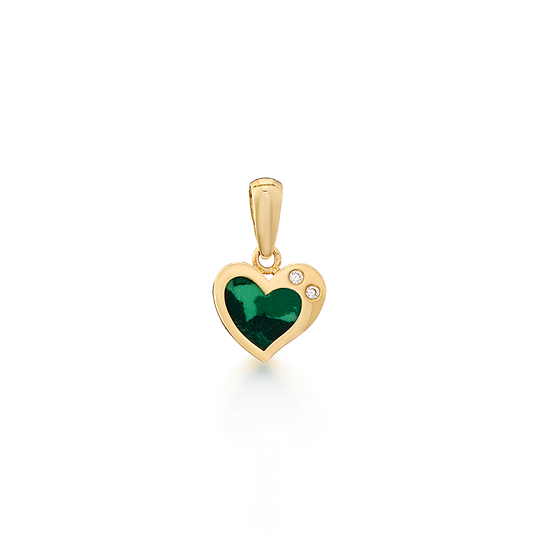 Medalha em ouro de 9 quilates têm formato de coração com detalhe em pedra verde malaquite e duas zircónias incolores, criando um contraste moderno e luminoso. Perfeita para usar no dia a dia ou oferecer como símbolo de afeto.