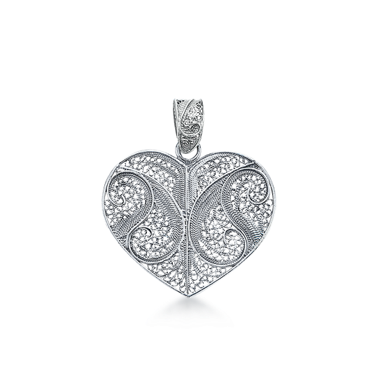 Medalha de filigrana em prata em forma de coração. Resultado da aliança entre a tradição da Ourivesaria Portuguesa e o design contemporâneo, esta é uma jóia de filigrana para a mulher moderna.