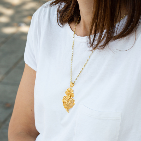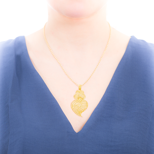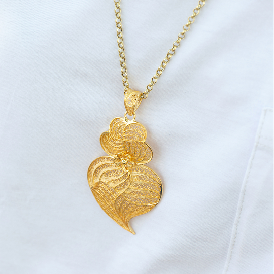 Medalha de filigrana em prata dourada com forma de coração de Viana. De referência histórica na joalharia tradicional portuguesa, a filigrana eleva o carisma da destreza manual. O coração de Viana é uma dos maiores símbolos da portugalidade.