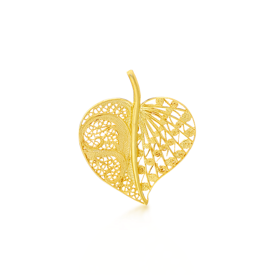 Medalha de fligrana em prata dourada, em forma de folha. A argola fica escondida, podendo ser usada com vários tipos de fios.