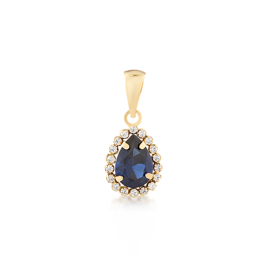 Medalha em ouro de 9 quilates em forma de gota com zircónia azul e pequenas zircónias incolores à volta.