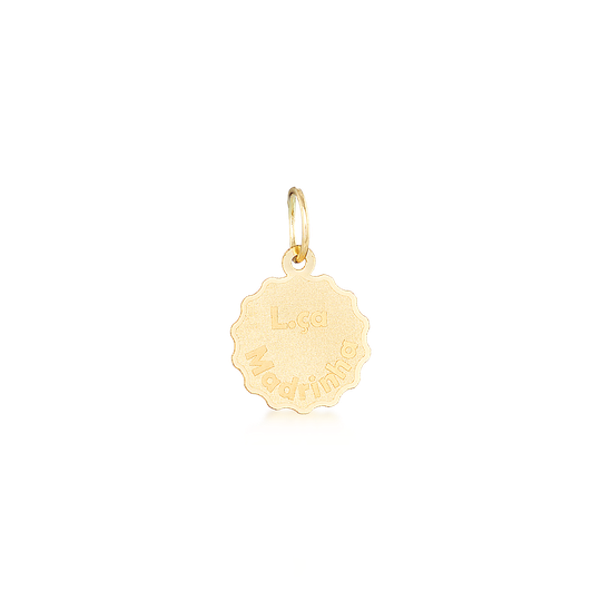 Medalha em ouro de 19,2 quilates com a inscrição "Lembrança de Madrinha". Forma redonda com efeito ondulado na extremidade. Permite uma gravação no verso da medalha. Uma opção revivalista de madrinha para afilhados.