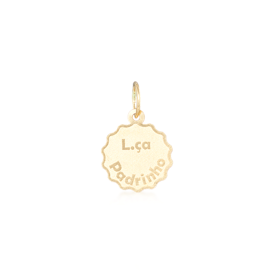 Medalha em ouro de 19,2 quilates com a inscrição "Lembrança de Padrinho". Forma redonda com efeito ondulado na extremidade. Permite uma gravação no verso da medalha. Uma opção revivalista de padrinho para afilhados.