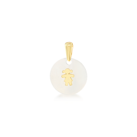 Medalha redonda em madrepérola com menina em ouro de 9 quilates. Para trazer uma menina especial junto ao coração.
