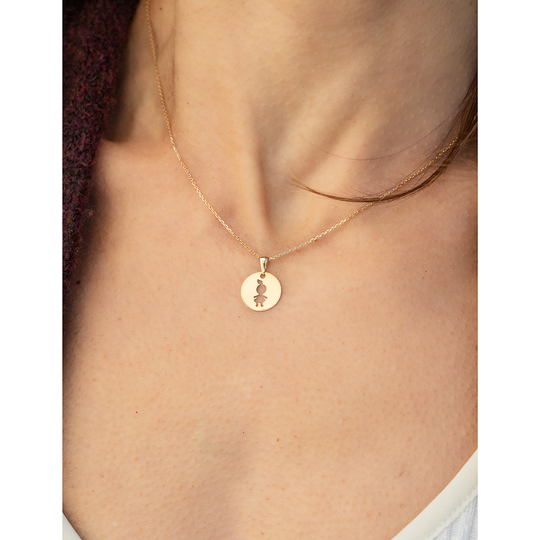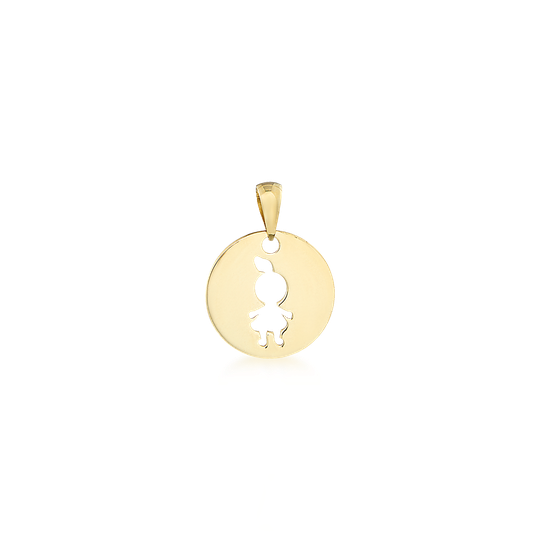 Medalha em ouro de nove quilates com figura de menina recortada. Para ser usada por miúdos e graúdos.