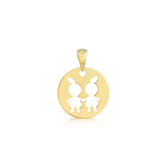 Medalha em ouro de nove quilates com figura de duas meninas recortada. Para ser usada por miúdos e graúdos.