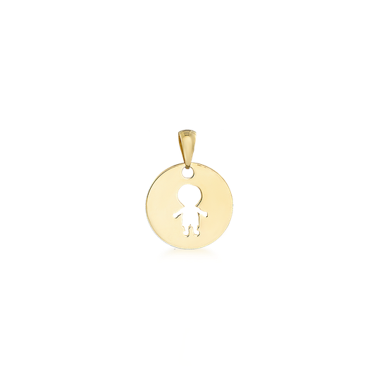 Medalha em ouro de nove quilates com figura de menino recortada. Para ser usada por miúdos e graúdos.