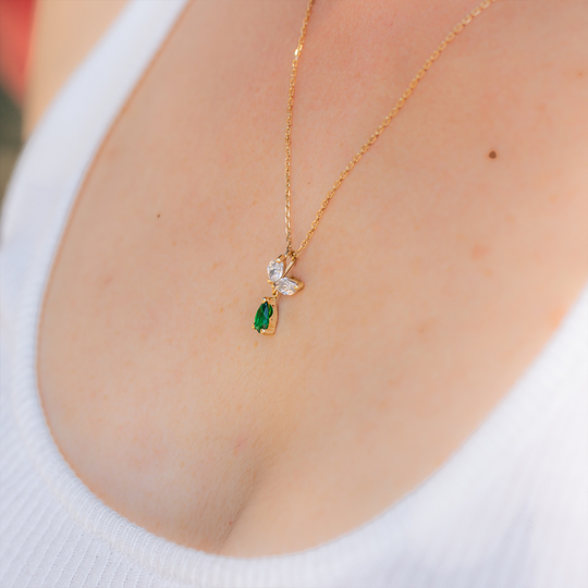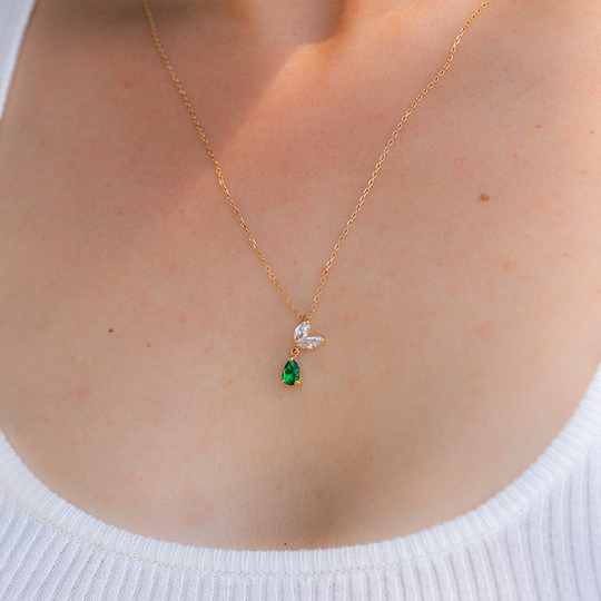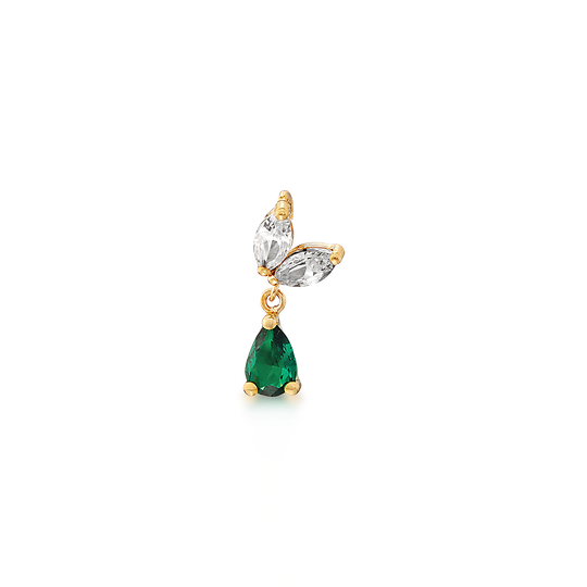 Medalha em ouro de 9 quilates com zircónias incolores em forma de pétala e zircónia verde pendurada em gota, criando um movimento leve e efeito orgânico. A argola fica discretamente escondida, destacando apenas o brilho das pedras.
