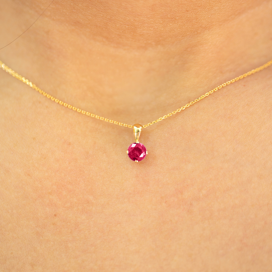 Medalha em ouro de 9 quilates redonda com zircónia vermelhor romã. Para usar com o seu fio preferido. Calor a Cores é uma coleção de jóias de tons dourados e cores brilhantes.
