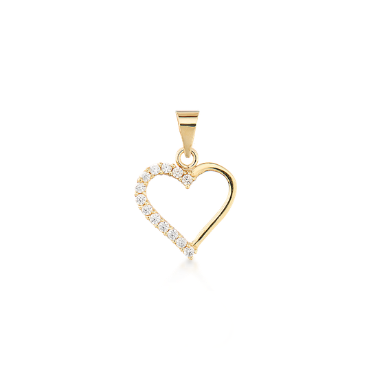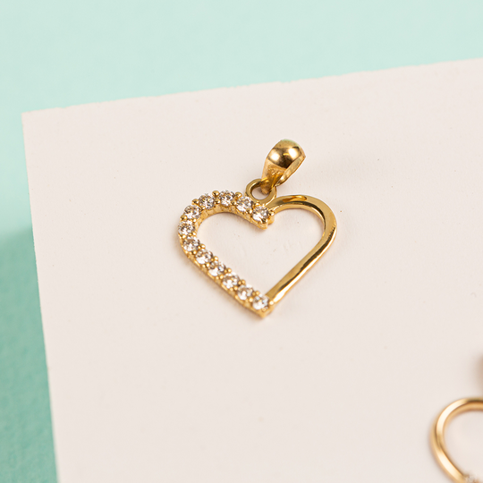 Medalha em ouro de 9 quilates em forma de coração recortado. Metade do coração é cravado com zircónias incolores.