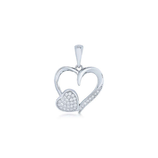 Medalha em prata com zircónias. Forma de coração com interior aberto e pequeno coração do lado esquerdo.